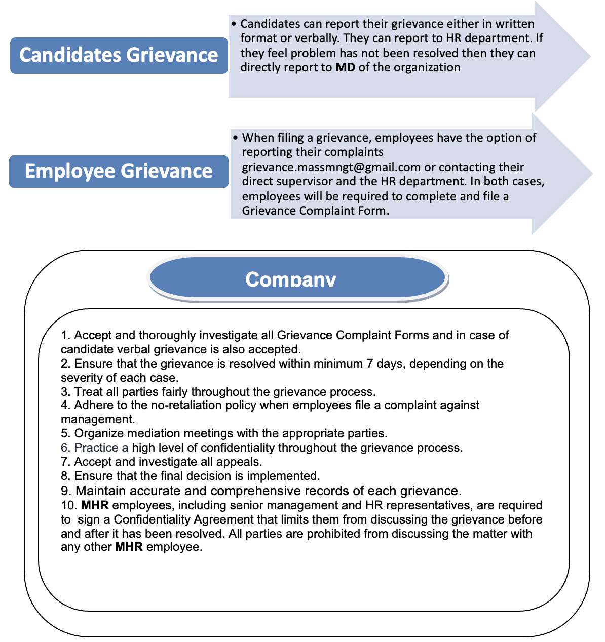 Mass Human Resource Pvt. Ltd (MHR) is aware that there may be times when candidates, employees, clients, and suppliers need to file an official complaint about unlawful and unethical practices, unjust treatment, harassment, and/or health and safety concerns in the workplace. This grievance procedure was created to clearly outline the process for these instances to ensure that all persons related to our company are heard and treated equally.